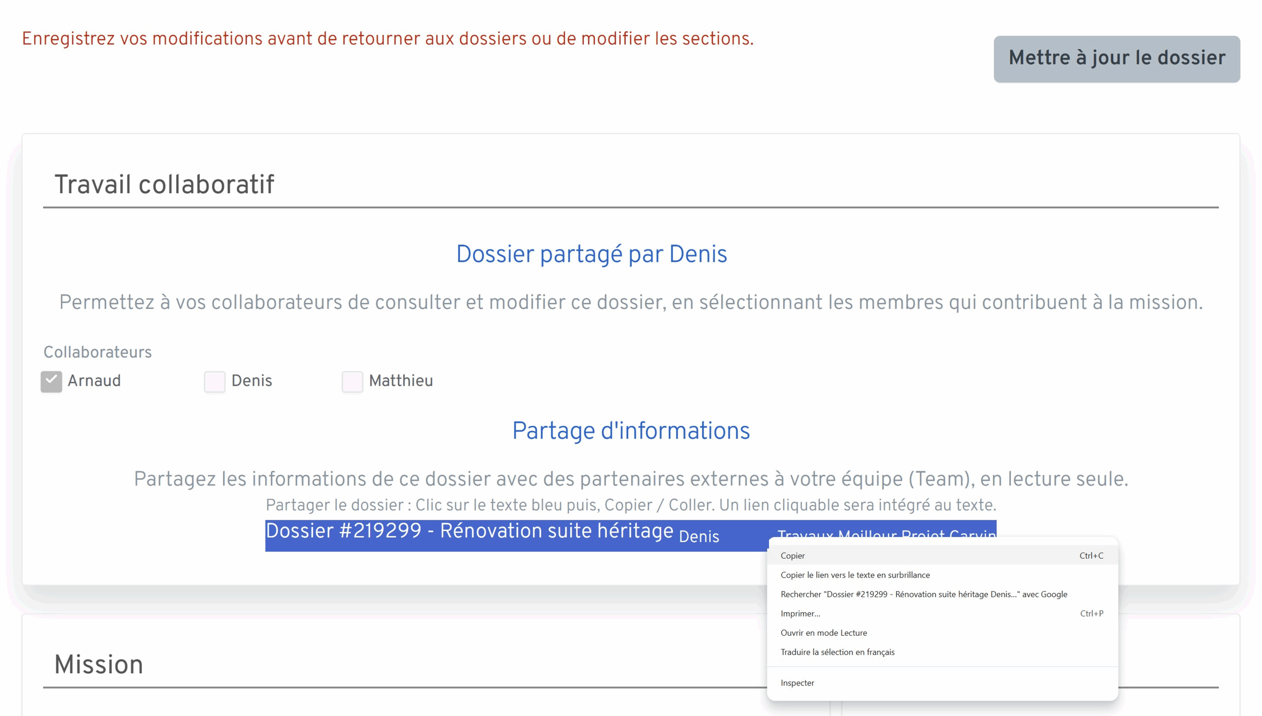• Les collaborateurs peuvent lire et modifier tous les éléments du dossier, vous restez le « Propriétaire » de votre dossier.